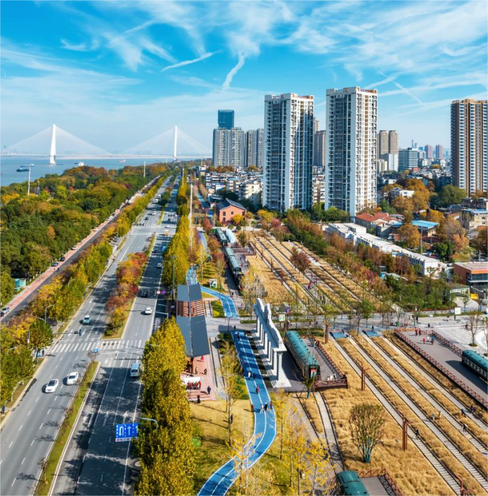 項(xiàng)目全線通過鐵路肌理與鐵路元素的保留、歷史建筑的改造、自然景觀的塑造等方式,搭建一條展示鐵路文明與園林生態(tài)交織的風(fēng)景線,融入武漢“百里沿江生態(tài)文化長廊”,極大地提升長江主軸城市功能及環(huán)境品質(zhì),成為展示武漢城市形象的重要窗口。