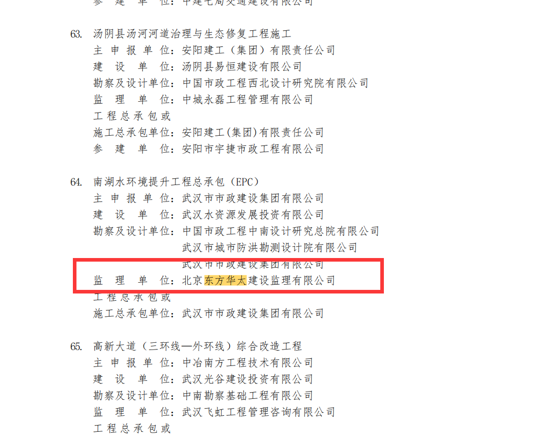 近日,中國市政工程協(xié)會公布“2024年度通過市政工程最高質(zhì)量水平評價工程名單”,其中東方華太公司承監(jiān)的南湖水環(huán)境提升工程總承包(EPC)、武昌生態(tài)文化長廊工程(友誼大道-建設(shè)十路)PPP 項(xiàng)目榮獲“2024年度市政工程最高質(zhì)量水平評價”。